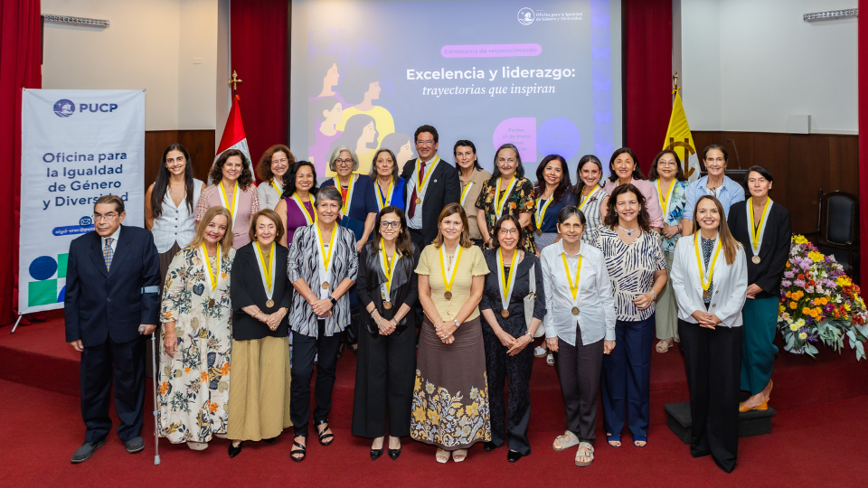 El pasado 24 de marzo, la Dra. Véronique Lecaros, jefa del Departamento Académico de Teología, fue homenajeada en la ceremonia Excelencia y Liderazgo: Trayectorias que Inspiran, organizada por la Oficina para la Igualdad de Género y Diversidad y el Rectorado. Este reconocimiento destacó a las primeras mujeres que asumieron cargos de autoridad, ya sea como vicerrectoras, decanas y jefas de departamento académico en la Universidad, valorando su aporte al fortalecimiento institucional y académico y en línea con la política de promoción de las mujeres de PUCP.