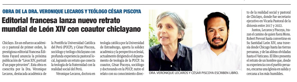 El libro León XIV, portrait d’un pape péruvien, publicado por la editorial francesa Éditions Fayard, ha generado interés en diversos medios de la región Lambayeque. La obra, escrita por la Dra. Véronique Lecaros, docente y jefa de nuestro Departamento, junto al teólogo chiclayano César Piscoya, doctorando en la PUCP y exsecretario ejecutivo de la Vicaría Pastoral de Chiclayo (2017–2022), ofrece un retrato actualizado del pontífice desde una perspectiva teológica y pastoral vinculada al Perú.